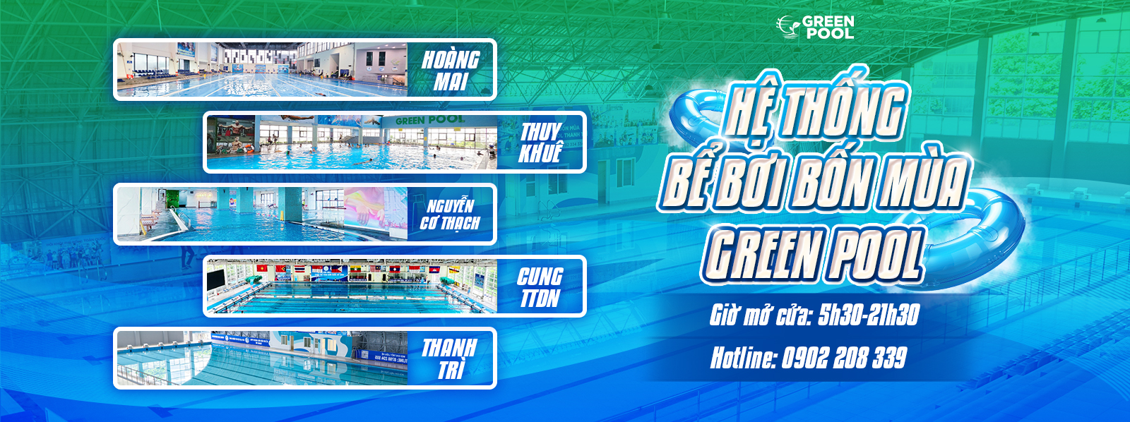 Hệ thống bể bơi bốn mùa Green Pool cung cấp những dịch vụ bơi bốn mùa, đào tạo từ bơi cơ bản đến nâng cao, đào tạo thi đấu và tổ chức thi đấu cho các đơn vị có nhu cầu.